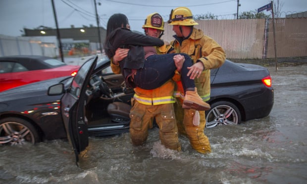 A firefighter carries a woman from her car after it was caught in street flooding.